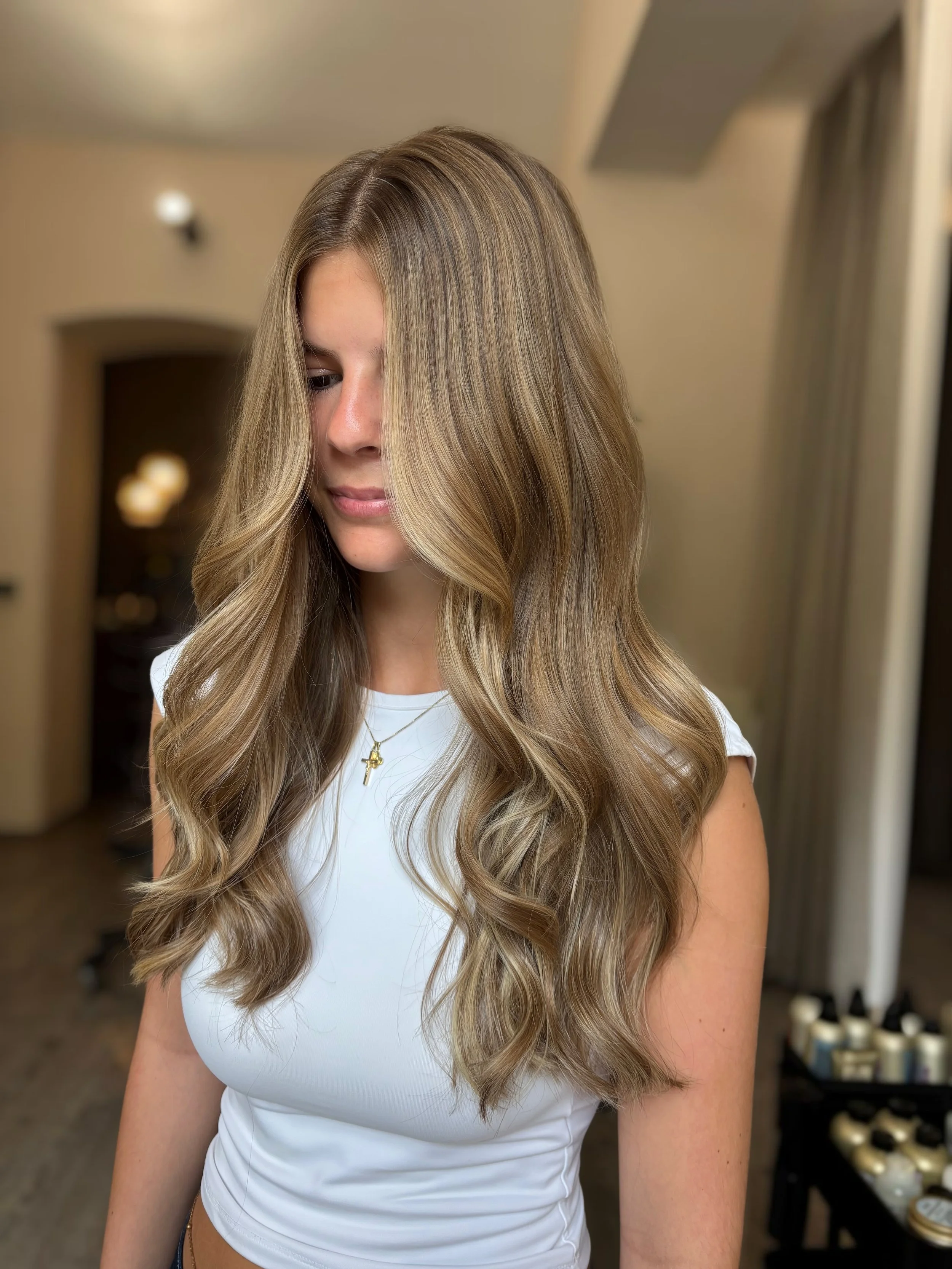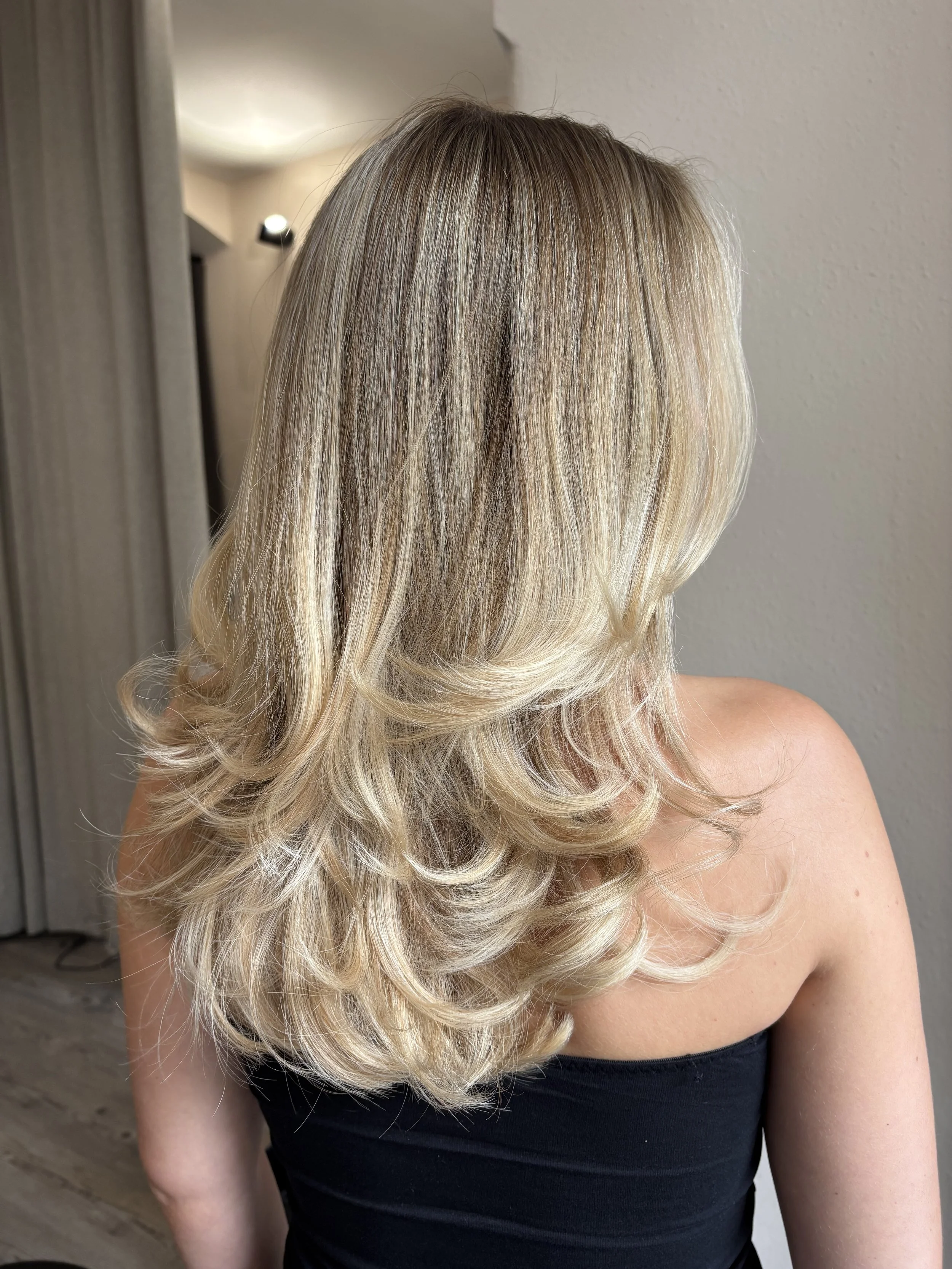 Sanfte Highlights, freihändig ins Haar gearbeitet – für natürliche Übergänge und diesen „Sun-kissed Glow“. Kein harter Ansatz, kein Stress – einfach zeitlos schön und easy im Alltag.